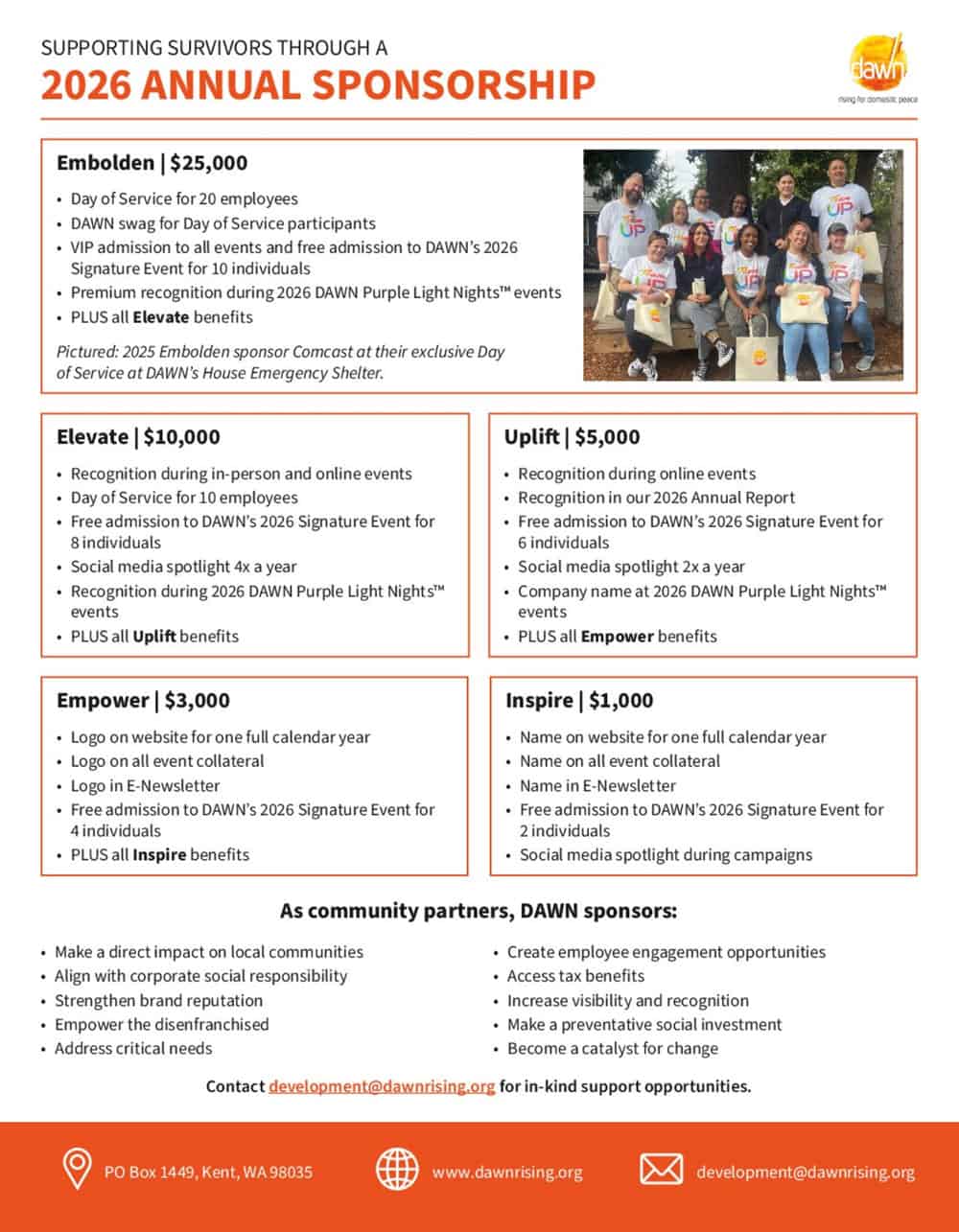 Partnerships and community support play a large role in our agency’s success. Sponsorship support provides us with unrestricted funding opportunities that not only help us close financial gaps, but also aligns with our values, and ensures that we can continue to best cater to our survivors and their wide variety of needs. Sponsorships also communicate a message of unity, strength, and dedication to rising up for domestic peace in our community.